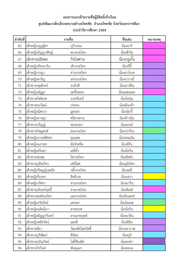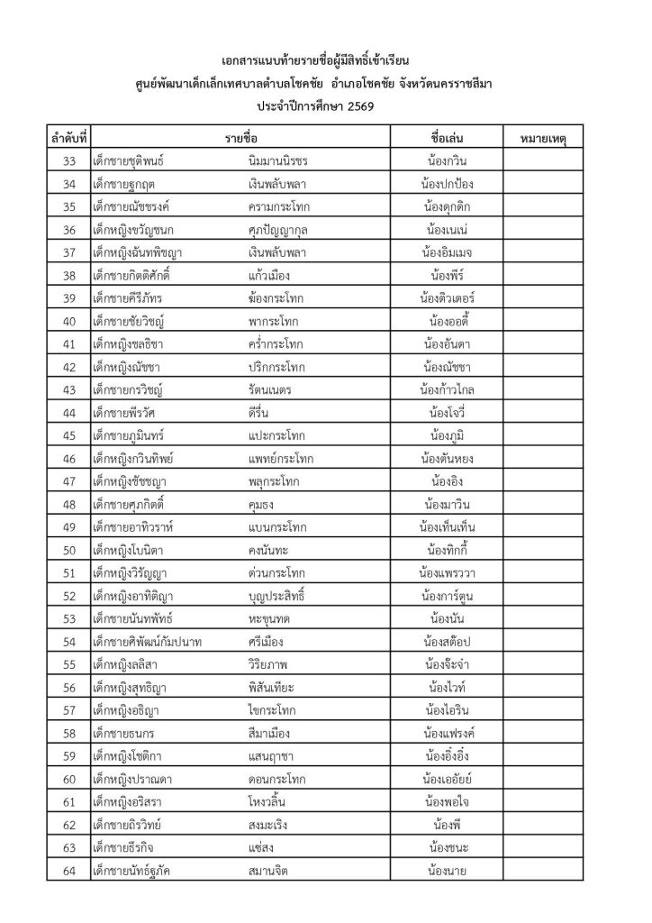 ประกาศรายชื่อเด็กเข้าเรียน ศูนย์พัฒนาเด็กเล็กเทศบาลตำบลโชคชัย ประจำปีการศึกษา 2569