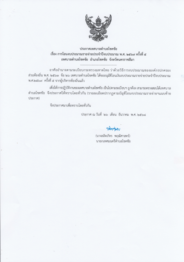 ประกาศเทศบาลตำบลโชคชัย เรื่อง การโอนงบประมาณรายจ่ายประจำปีงบประมาณ พ.ศ.2569 ครั้งที่ 5 เทศบาลตำบลโชคชัย อำเภอโชคชัย จังหวัดนครราชสีมา 26 ธ.ค. 68 แชร์