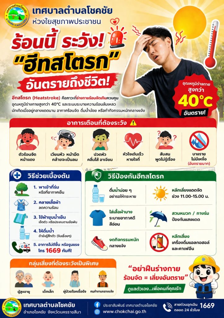 เทศบาลตำบลโชคชัย ขอส่งความห่วงใยถึงทุกท่าน ☀️ ร้อนนี้…ระวัง “ฮีทสโตรก” อันตรายถึงชีวิต! 17 เม.ย. 69 แชร์ เทศบาลตำบลโชคชัย ขอส่งความห่วงใยถึงทุกท่าน ร้อนนี้…ระวัง “ฮีทสโตรก” อันตรายถึงชีวิต! ตัวร้อนจัด เวียนหัว หน้ามืด หัวใจเต้นแรง อุณหภูมิร่างกายเกิน 40°C = เสี่ยงเสียชีวิต ช่วยด่วน เข้าที่ร่ม + เช็ดตัว + จิบน้ำ โทร 1669 ทันที ดื่มน้ำบ่อย เลี่ยงแดดจัด 11.00–15.00 น. อย่าฝืนร่างกาย ด้วยความห่วงใยจาก “เทศบาลตำบลโชคชัย” #ฮีทสโตรก #เตือนภัยหน้าร้อน #เทศบาลตำบลโชคชัย