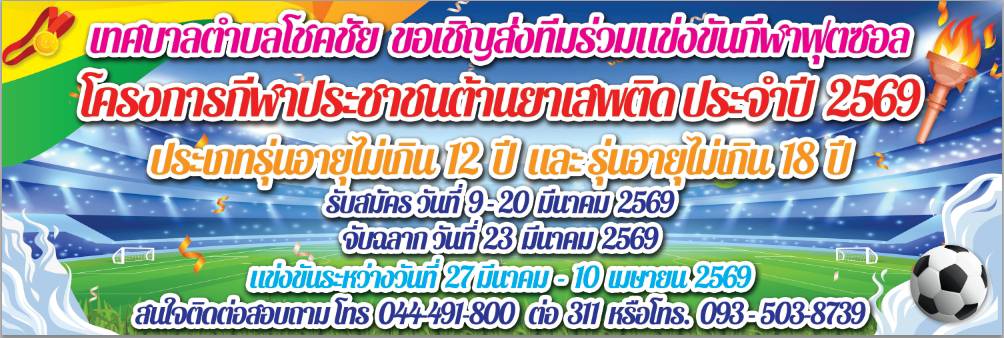 เทศบาลตำบลโชคชัย ขอเชิญร่วมส่งทีมร่วมแข่งขันกีฬาฟุตซอล”โครงการกีฬาประชาชนต้านยาเสพติด ประจำปี 2569″