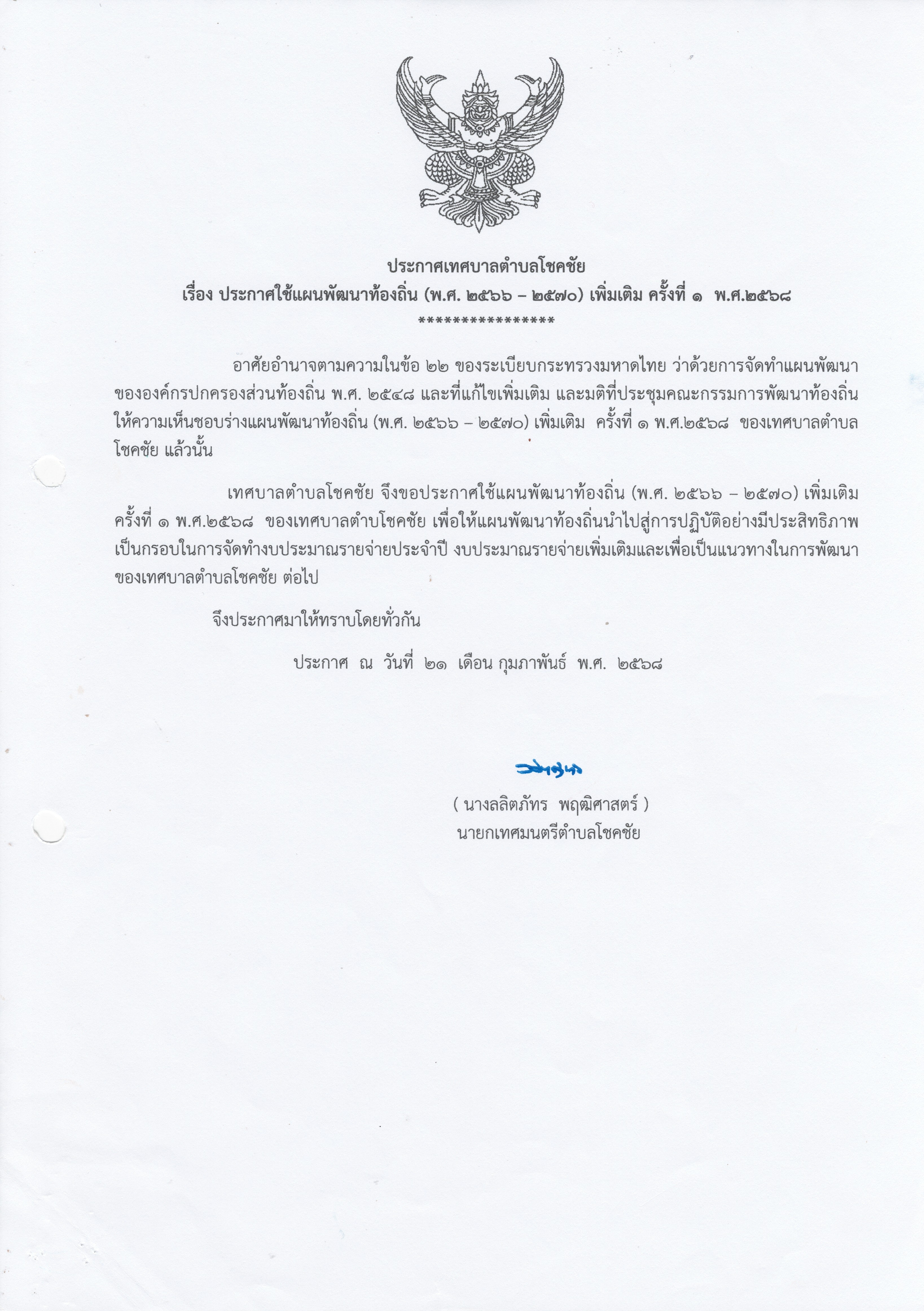 ประกาศ แผนพัฒนาท้องถิ่น (พ.ศ.2566-2570) เพิ่มเติม ครั้งที่ 1 พ.ศ.2568