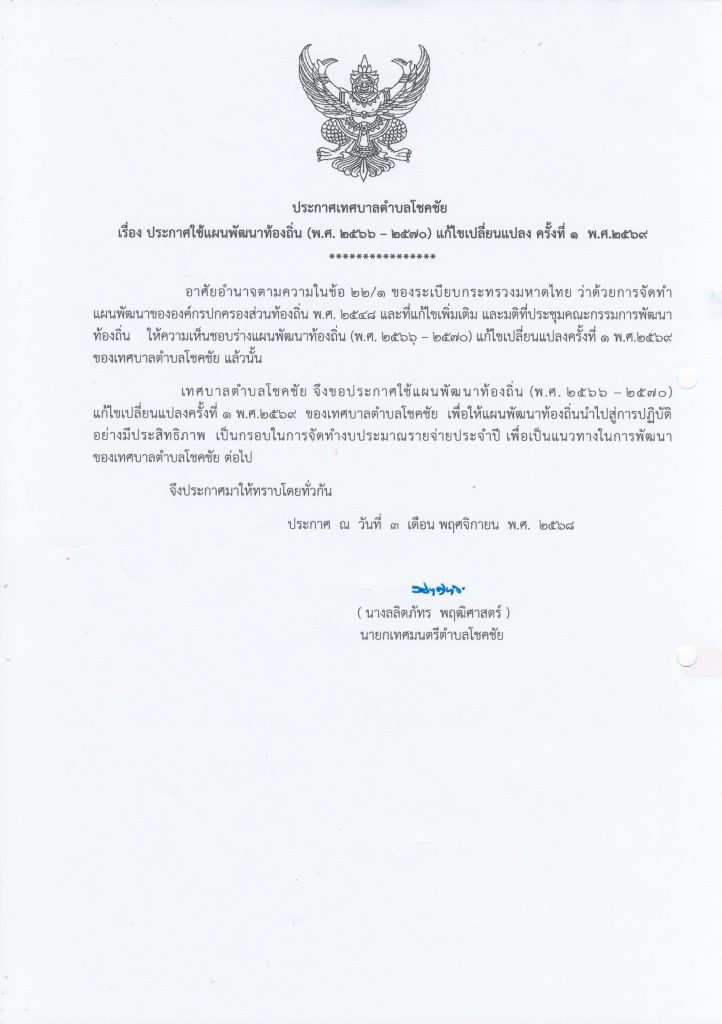ประกาศ แผนพัฒนาท้องถิ่น (พ.ศ.2566-2570) แก้ไขเปลี่ยนแปลง ครั้งที่ 1 พ.ศ.2569